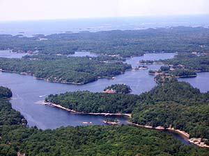 Here is a shot of Craganmor Point on McLaren Island in the South Channel near Seven Mile Narrows. Our cottage can be seen in the lower center of the photo, just above a small island in the channel. You can clearly see the bright blue tarp covering my work boat, which is in storage on a marine railway build by Brent Warga on our beach.